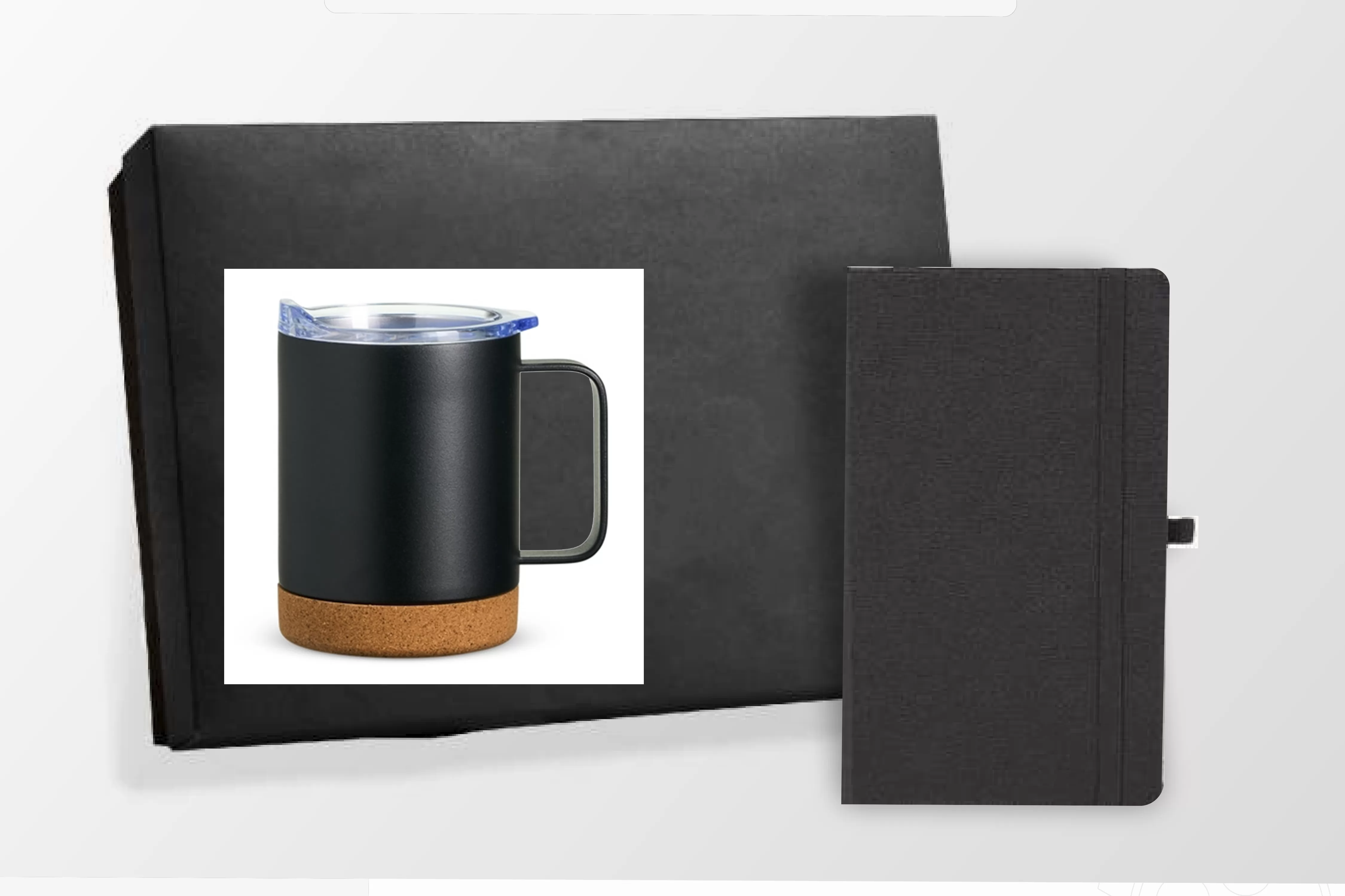 Conta com caderno para anotações preto com capa dura e Caneca Térmica de 400ml feita em inox com fundo de cortiça, tampa com bocal e trava de segurança.